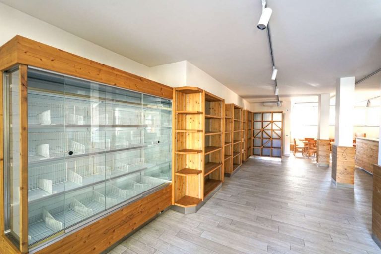 L’attuale suddivisione degli spazi interni è composta da due spazi principali, il primo è il punto dove oltre all’esposizione delle merci viene servito il cliente, il secondo dove in aggiunta allo spazio per la preparazione dei prodotti, è presente una zona a deposito e una zona dotata di cella frigorifera per la conservazione dei prodotti.