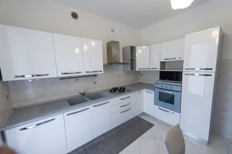 Ingresso sulla ampia zona giorno, cucina abitabile e bagno finestrato con doccia, disimpegno ,due camere da letto, un secondo bagno padronale con vasca e doccia, anch’esso finestrato.
