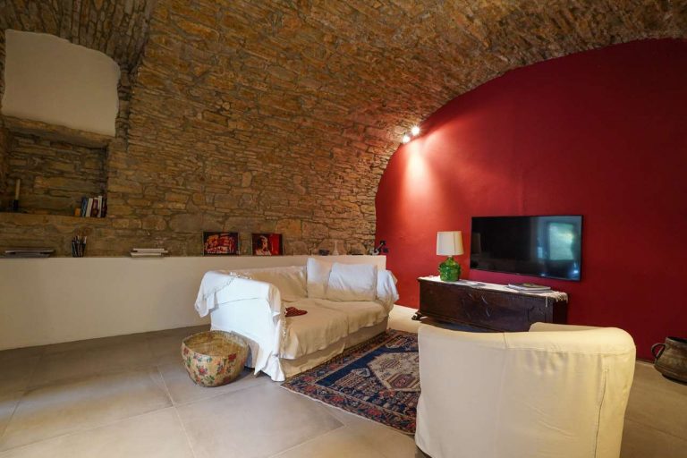 Al piano terra si sviluppano un accogliente ingresso, una cucina abitabile, una sala da pranzo luminosa, un soggiorno incastonato nella roccia — autentico gioiello architettonico — e una terrazza panoramica che domina il verde circostante.